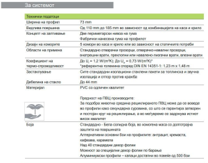 Отварачкиот систем – Brügmann bluEvolution 73 ќе ги задоволи сите ваши потреби за дизајн на прозорци со стил и софистицираност: Површините со висока густина не само што го прават профилот особено лесен за чистење, туку исто така гарантира исклучително долг работен век. Овој систем ги спречува топлинските мостови и значително ги намалува трошоците за енергија. Интелигентниот структурен дизајн на профилот, кој содржи големи челични засилувања, обезбедува одлична стабилност и сигурна функционалност на ПВЦ прозорците